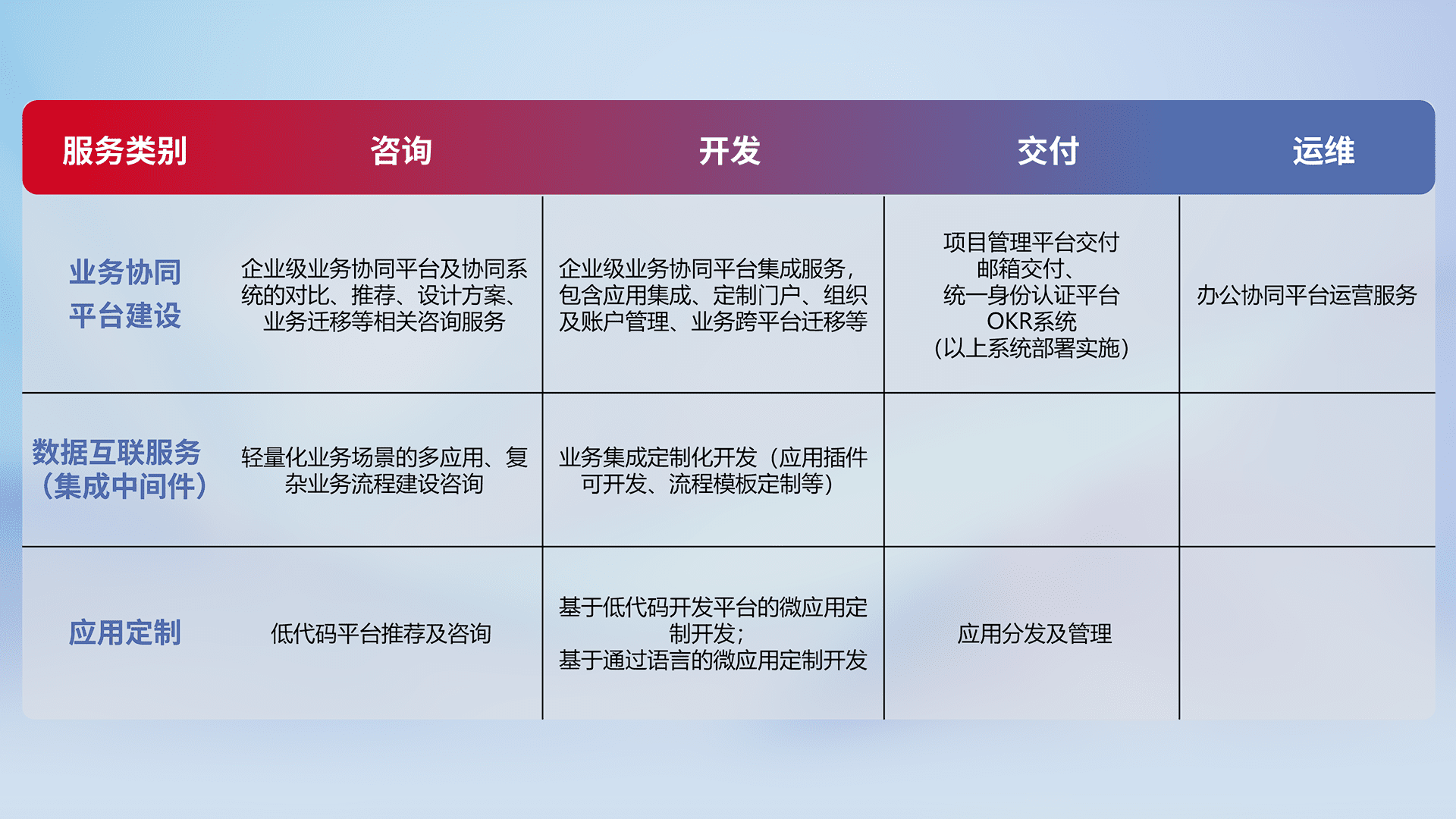 基于全代码低代码的数字化应用系统开发及交付,,,满足特定业务场景的应用开发及集成,,提升企业业务信息化及数字化能力。。
